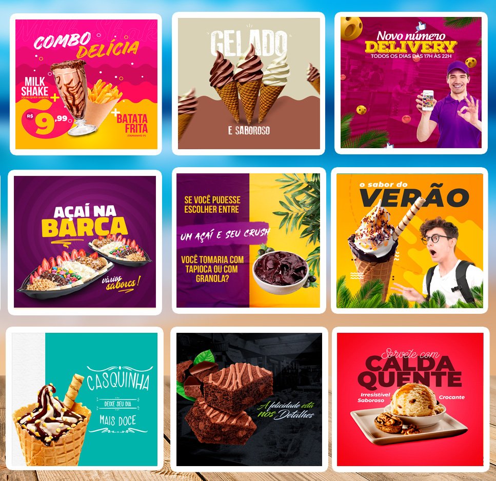 Super Pack Sorveteria e Açaiteria Editáveis no Photoshop, é um Pack com artes editáveis pronto para você colocar sua logomarca, substituir núcleos, textos, acrescentar algo ao seu gosto e divulgar onde quiser e nas suas redes sociais.
